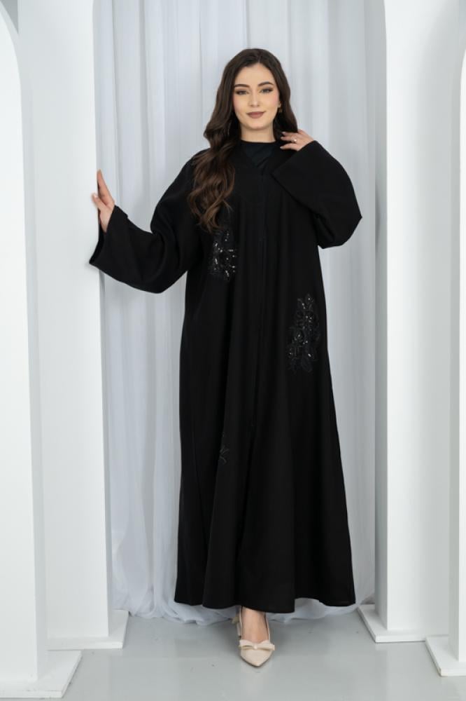 تميزي بإطلالة ساحرة مع عباية سواد مميز المصممة بقماش لمار الفاخر، الذي يجمع بين النعومة والرقي. تصميمها الأسود الكلاسيكي يجعلها قطعة أساسية في دولاب كل امرأة أنيقة.